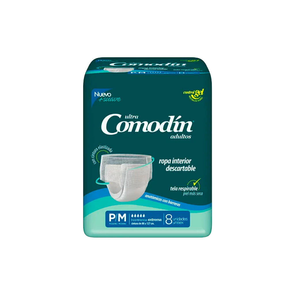COMODIN® ROPA INTERIOR es la solución ideal para quienes requieren comodidad y discreción en situaciones de incontinencia extrema. Este pack incluye 8 unidades de ropa interior descartable unisex en talles P/M, diseñadas para adaptarse a contornos de cintura de 80 a 127 cm. Su innovador Control GEL neutraliza olores, brindando una sensación de frescura y seguridad. La tela respirable y la cintura elastizada aseguran un ajuste perfecto, similar al de la ropa interior convencional. Además, son completamente nuevas y libres de látex, lo que las hace adecuadas para personas con sensibilidades. Cada paquete contiene 8 unidades, garantizando máxima absorción y protección. Ideal para el uso diario o situaciones especiales, COMODIN® ROPA INTERIOR es la elección perfecta para quienes buscan confianza y comodidad.